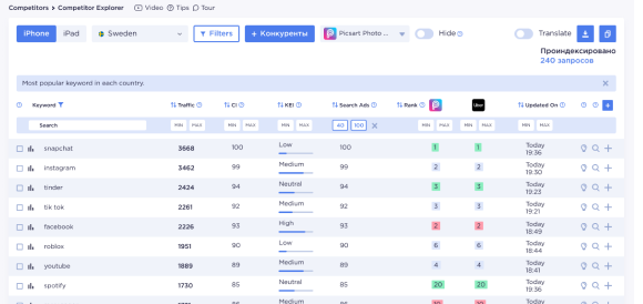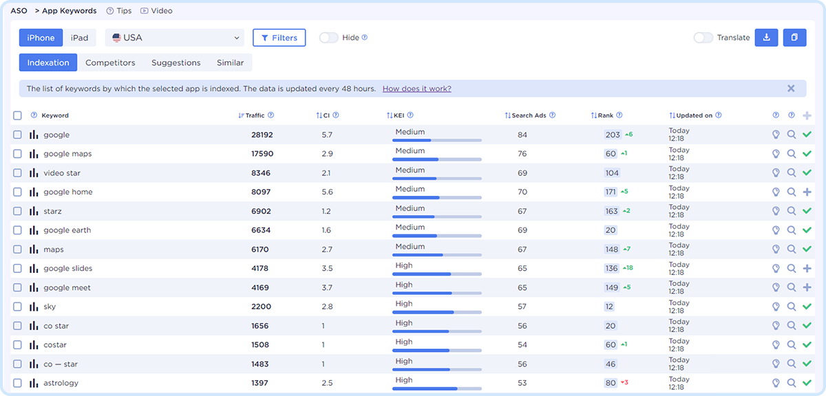 In the Fivorix App Keywords tool, in the Indexing section, you can see which keywords (search queries) your app can be found by users (as well as any other application). All search queries are displayed with the following values: traffic, app position in search results, complexity and efficiency.