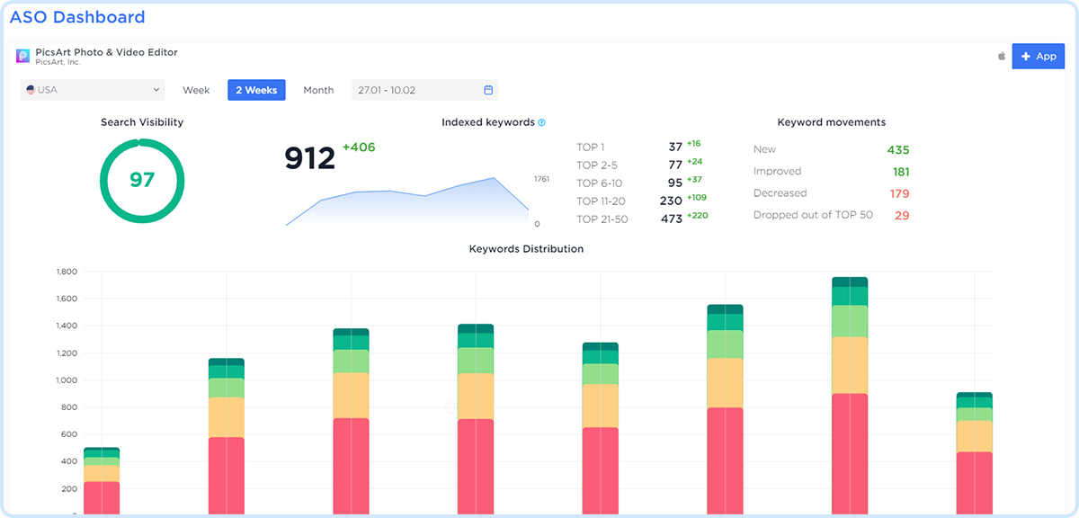 ASO (App Store Optimization) is the process of optimizing a page of a mobile application in an application store (Google Play, App Store) in order to improve its visibility for the user by the maximum number of search queries. After App Store optimization using Fivorix, the number of organic downloads increases because of covering more keywords.