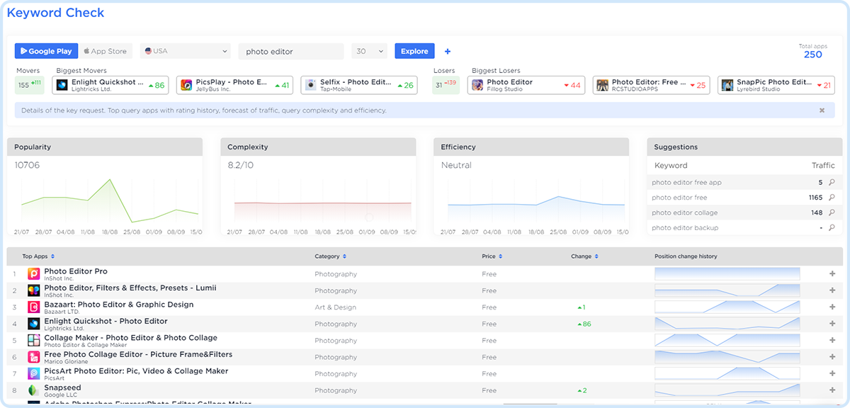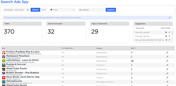 In the Fivorix Keyword Check, you can see the TOP 30 applications in the search results for any keyword (search query). As well as search volume, performance, and suggestions for any search query.