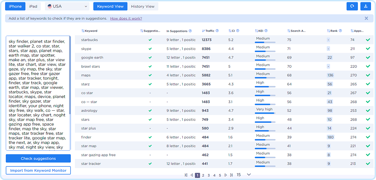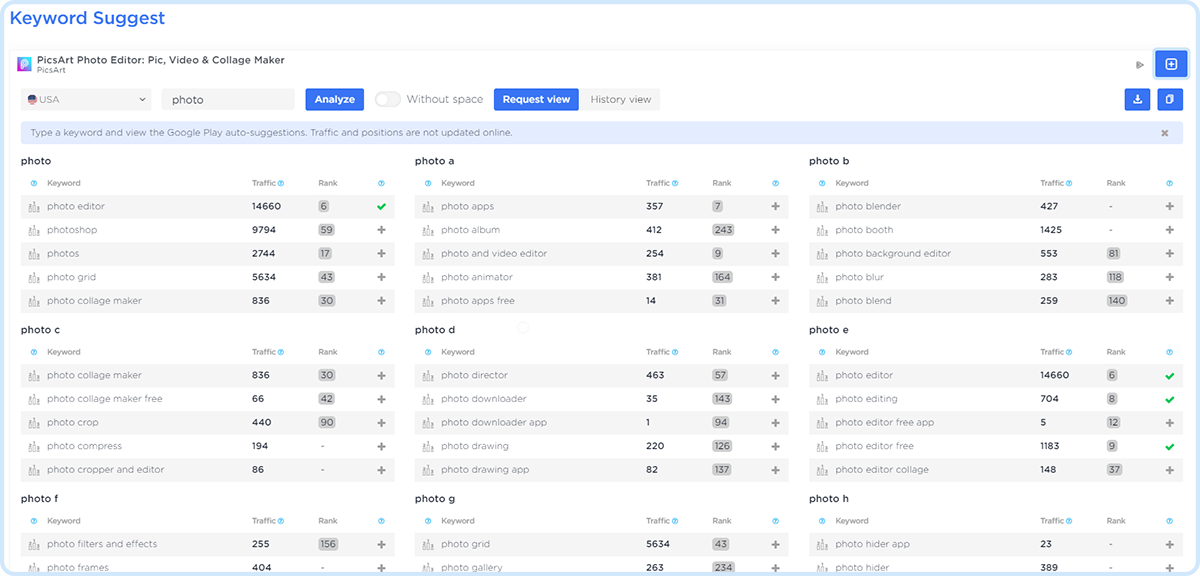 In the Fivorix Keyword Suggest section, enter the keyword you are interested in and get all the suggestions offered by Google Play or the App Store (alphabetically). Also, if you click the "No space" switch, you can check what suggestions the market offers when entering multiple characters.