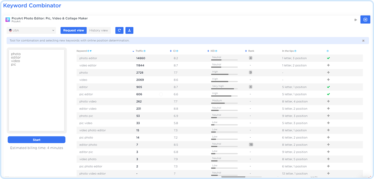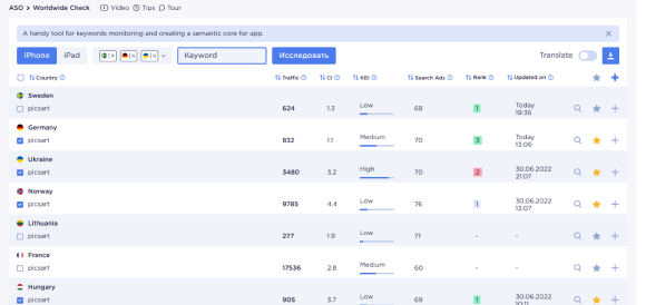 In Fivorix Keyword Monitor, you can check the position of any app by a keyword (search query) you are interested in with a graph of changes for a selected period, as well as with the following values: traffic, complexity, and efficiency. Data is updated every 4 hours or online upon request.