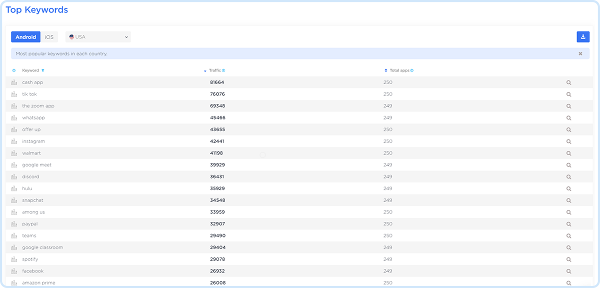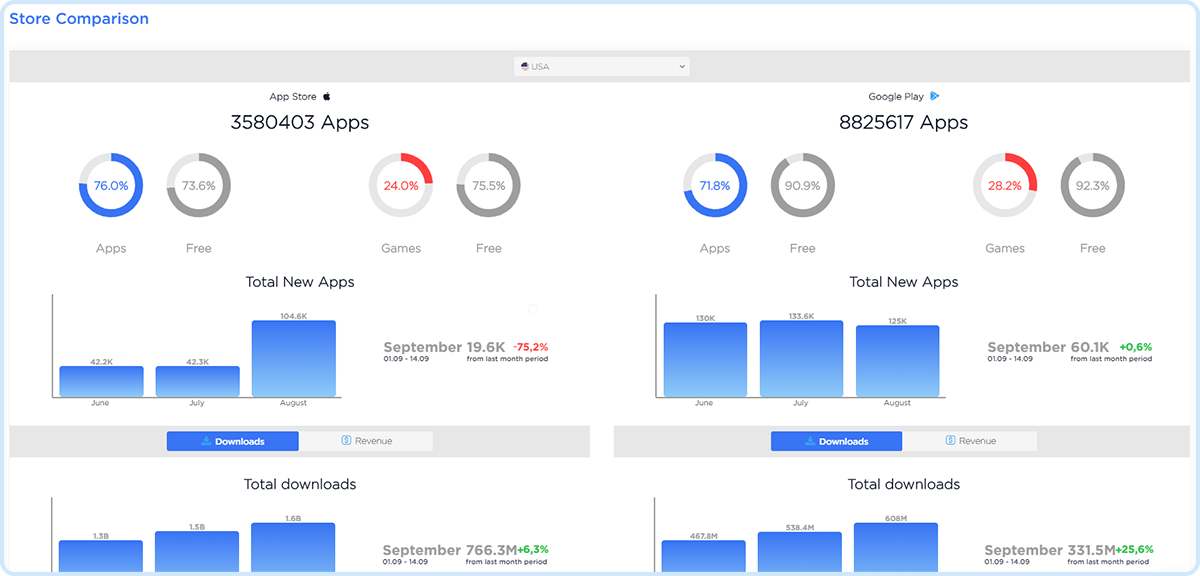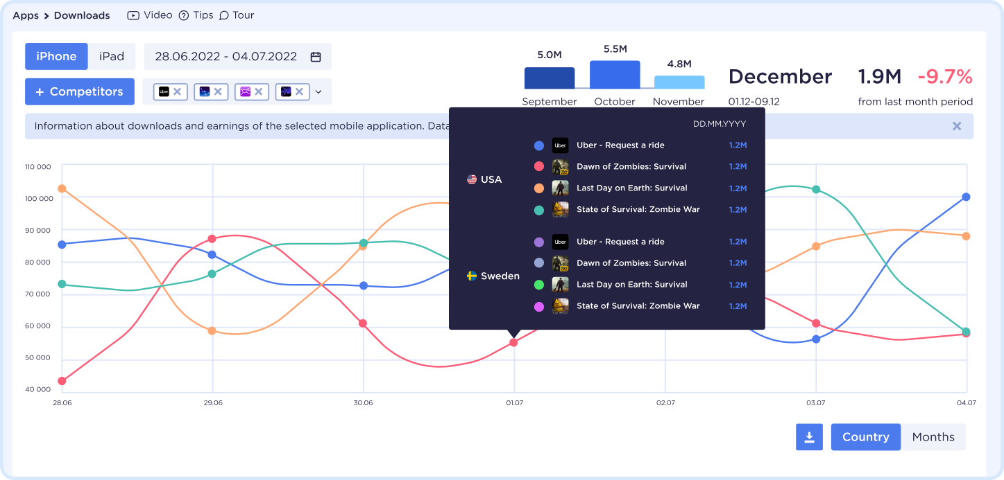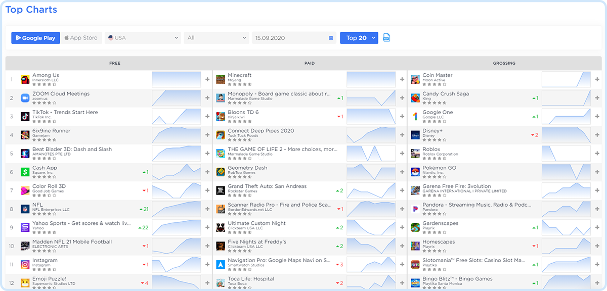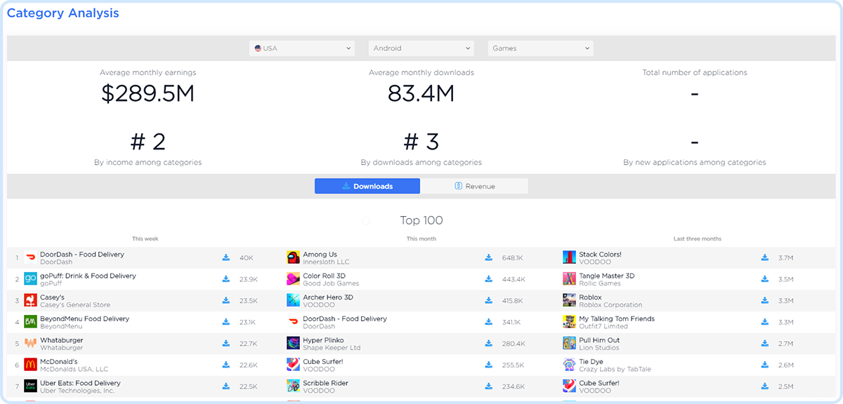 You will be able to find data on downloads and revenue for any app that has a rating (position) in the category of mobile applications market using Fivorix